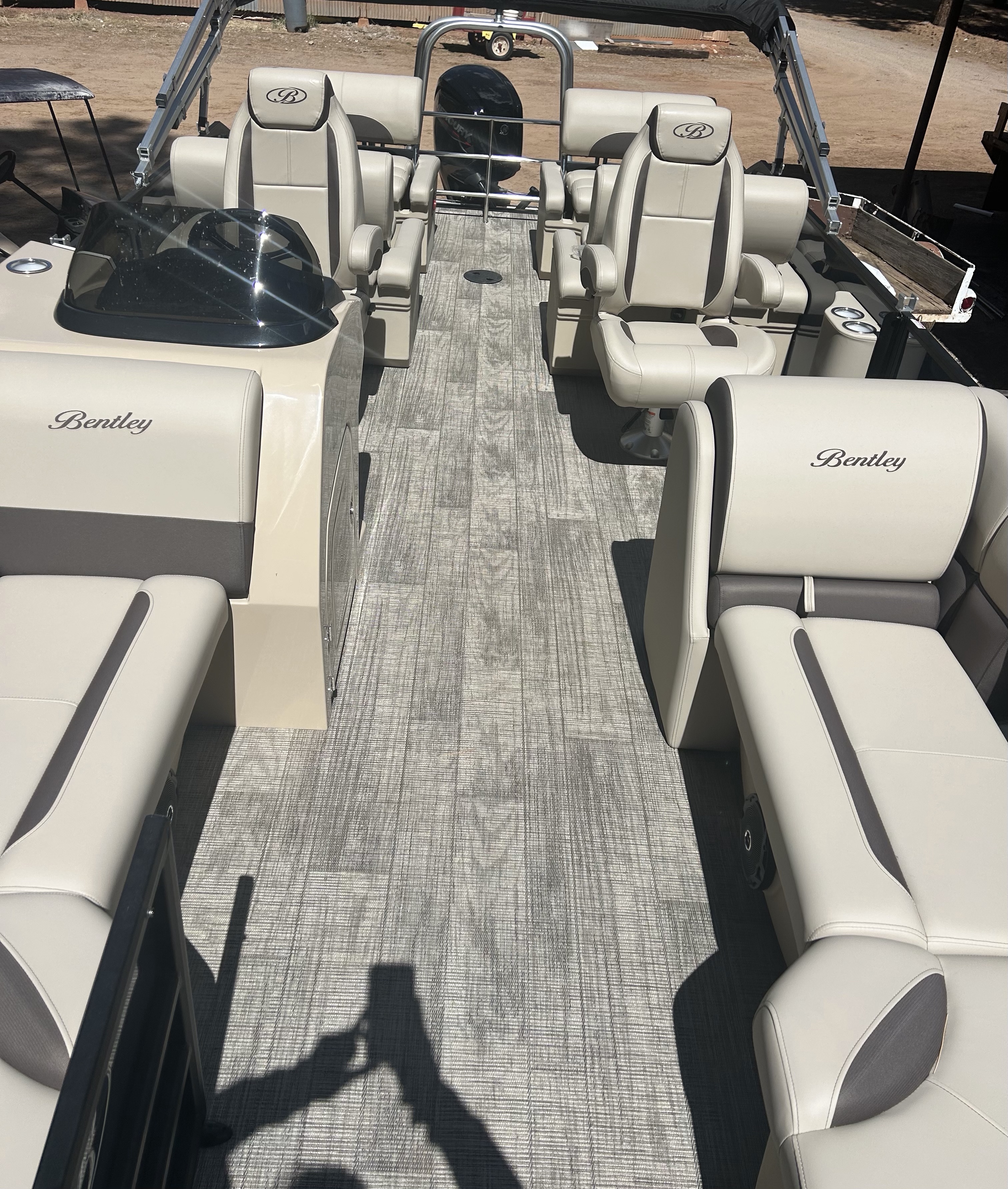 This 12 person pontoon comes with a Bimini Top, life jackets, throw cushions, paddle, and a 90hp Mercury Outboard. Maximum weight capacity is 2180 lbs.